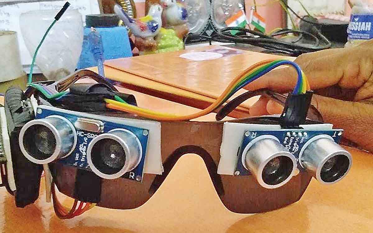 ""இந்தக் கண்ணாடியில் சென்சார், வைபரேட்டர் கருவி, ஸ்பீக்கர் பொருத்தி தயார் செயயப்பட்டுள்ளது. கண்ணாடியைப் பார்வையற்றவர்கள் அணிந்து கொண்டு வெளியே செல்லும்போது, சென்சாரில் வெளிப்படும் சிக்னல் 3.7 அடி தூரத்தில் இடையூறு இருந்தால் எச்சரிக்கை ஒலி, அதிர்வை ஏற்படுத்தும். இதைப் பயன்படுத்தி இடையூறுகளில் இருந்து விலகி செல்ல முடியும்'' என்றனர்.