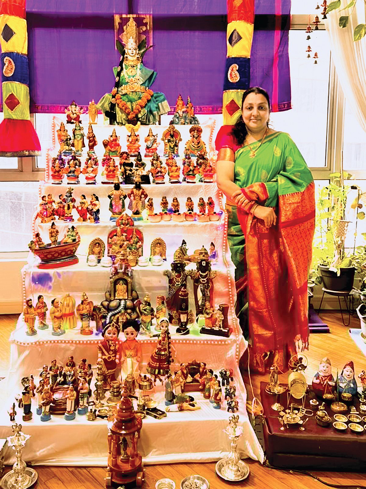 7 படிகள் அமைத்து அதில் துர்கை, லட்சுமி, சரஸ்வதி, நவசக்திகள், அஷ்ட லட்சுமிகள், ராமாயண, மகாபாரதக் காட்சிகள், கண்ணன் கதைகள், கார்த்திகைப் பெண்கள், கயிலாயக் காட்சிகள், சஷ்டியப்த பூர்த்தி, திருமலை ஏழுமலையான் உண்டியல், கருடன், இறை உருவங்கள் உள்ளிட்டவற்றை அடுக்கி வைத்துள்ளேன்.