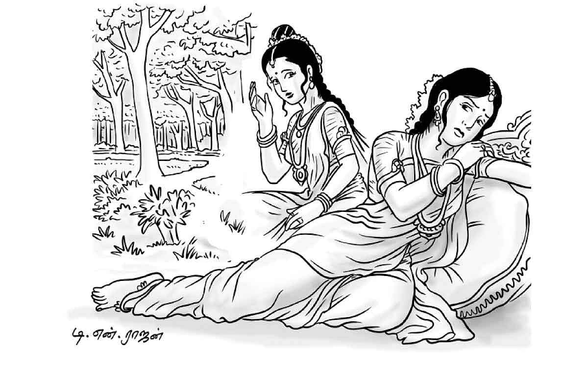 தலைவியைச் சேரிமகளிர் ஆற்றுவிக்க முயலலாம். ஆனால் தலைவியின் இயல்பை முற்ற உணர்ந்தவள் தோழியாதலால் தலைவன் மார்பில் கண் புதைத்து தூங்கும் தலைவியின் கண்கள் தலைவனைப் பிரிந்து எவ்வாறு இருக்கும் எனக் கலங்குகிறாள். இங்கு தலைவியின் துயரம் பேசப்படுகிறதேயன்றி தலைவன் துயர் கொண்டதாக இல்லை என்பது குறிக்கத்தக்கது.
