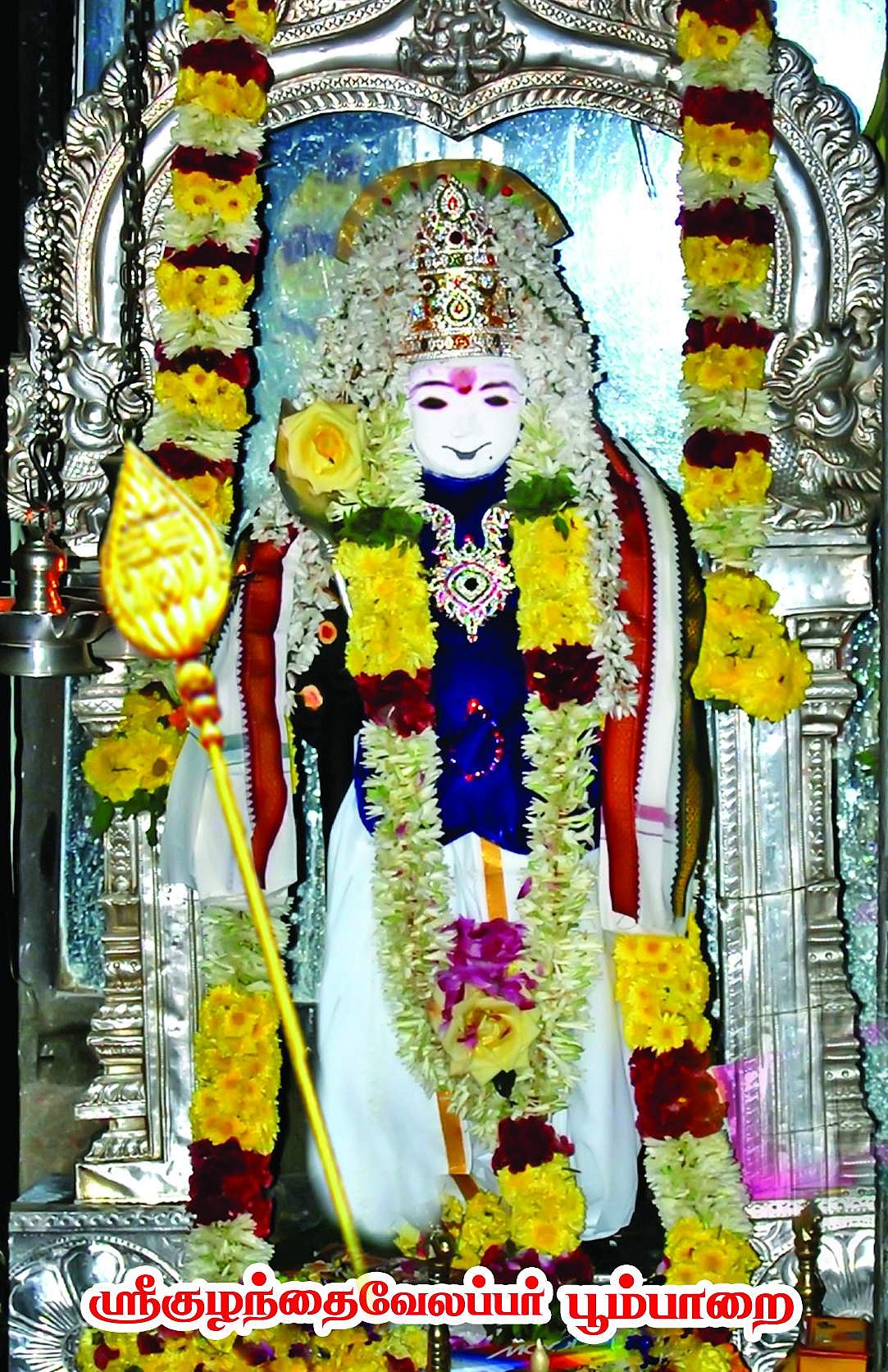 பூம்பாறை கோயிலுக்கு வந்த அருணகிரிநாதர் முருகனை வழிபட்டபின் அசதியில், கோயில் மண்டபத்தில் அயர்ந்து தூங்கினார். இரவில், அரக்கி ஒருத்தி அருணகிரிநாதரைக் கொல்ல வந்தாள். அப்பொழுது, முருகன் குழந்தை வடிவம் கொண்டு காவியுடை அணிந்திருந்த அருணகிரிநாதர் மீது ஏறி விளையாடிக் கொண்டிருந்தார்.