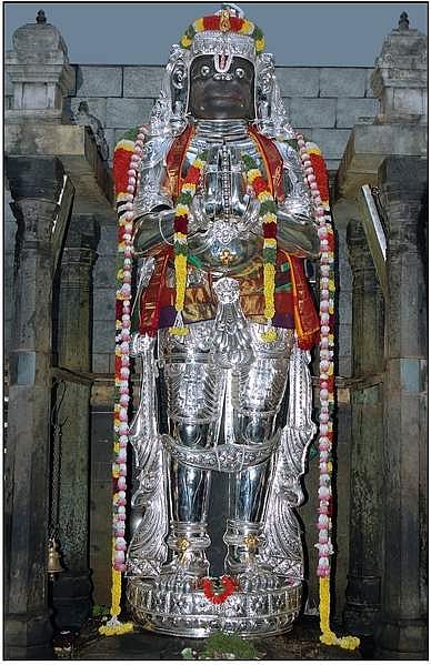 ராமன் போரில் வென்று சீதையை மீட்டபிறகு ஆஞ்சனேயர் மீண்டும் சாளக்கிராம இடத்துக்கு வந்தார். அப்போது, அது பெரியதாக வளர்ந்து ஒரு துளையில் லட்சுமி நரசிம்ம மூர்த்தியாக காட்சி தந்தார். நரசிம்மர் தோன்றி அனுமனிடம் "இனி இந்த மலையிலேயே தான் லட்சுமி நரசிம்மராக சேவை சாதிக்கப் போவதாகக்கூறி, தன் எதிரிலேயே நிலை கொண்டு பக்தர்களுக்கு அருள் செய்ய வேண்டும்' என்று உத்தரவிட்டார். அதுமுதல் கூப்பிய கரத்தோடும் இடுப்பில் வாளுடனும், சாளகிராமத்தால் ஆன மாலையும் அணிந்து காட்சி தருகிறார்.
