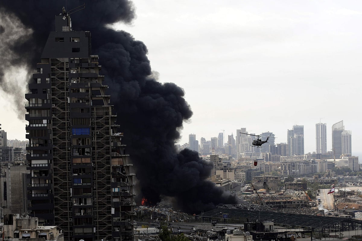 லெபனான் தலைநகர் பெய்ரூட் துறைமுகத்தில் மீண்டும் ஏற்பட்ட தீ விபத்தை அணைக்கும் பணியில் ராணுவ ஹெலிகாப்டர்கள் ஈடுபட்டுள்ளன.