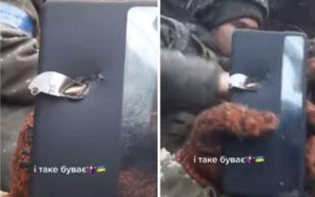 உக்ரைன் வீரரின் பாக்கெட்டில் இருந்த ஐபோன் ரஷிய வீரரின் 7.2 மி.மீ. குண்டு பாய்ந்துள்ளது. இதன் மூலம் உக்ரைன் வீரரின் உயிர் காக்கப்பட்டுள்ளது. ஐபோனில் குண்டு பாந்திருந்ததை உக்ரைன் வீரர்கள் விடியோ எடுத்துள்ளனர். இந்த விடியோ இணையத்தில் வைரலாகி வருகிறது.