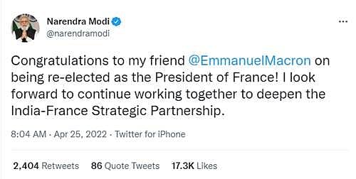 இது தொடர்பாக தனது ட்விட்டர் பக்கத்தில் வெளியிட்டுள்ள வாழ்த்து செய்தியில், "பிரான்சின் அதிபராக மீண்டும் தேர்ந்தெடுக்கப்பட்ட எனது நண்பர் இமானுவேல் மாக்ரோனுக்கு வாழ்த்துகள்! இந்தியா-பிரான்ஸ் உறவை வலுப்படுத்தும் வகையில் தொடர்ந்து இணைந்து பணியாற்ற ஆவலுடன் எதிர்நோக்கி காத்திருப்பதாக"க் கூறியுள்ளார்.