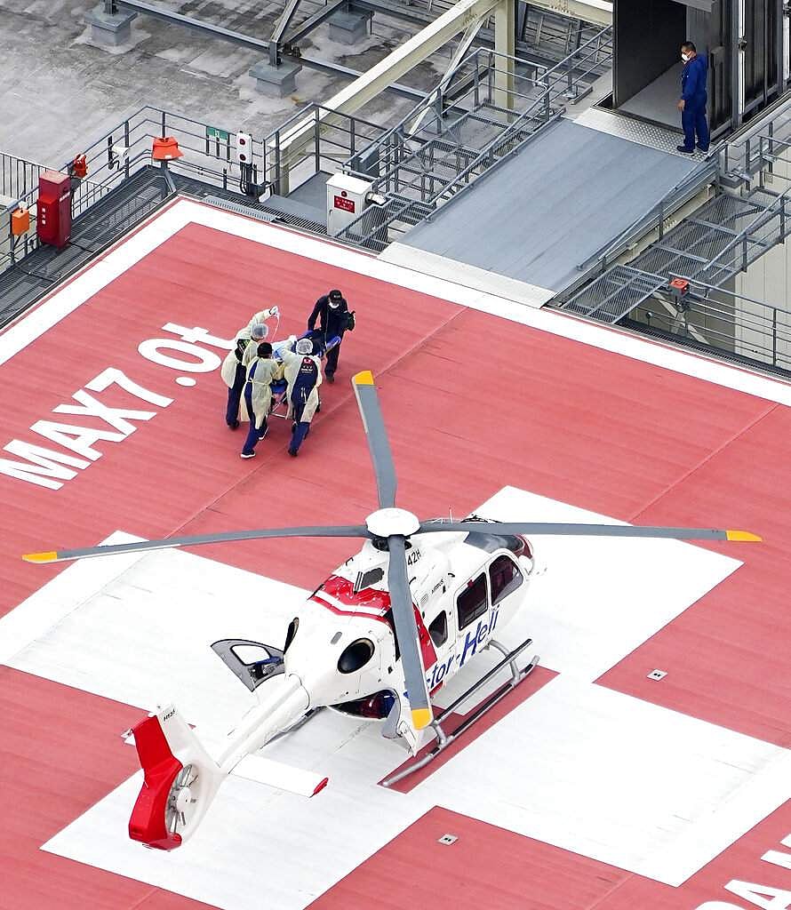 மருத்துவமனை மேல்தளத்தில் இறங்கிய ஹெலிகாப்டரிலிருந்து இறக்கி, மருத்துவமனைக்குள் பாதிக்கப்பட்ட ஒருவர், சுடப்பட்ட முன்னாள் பிரதமர் ஷின்சோ அபேவாகத்தான் இருக்க வேண்டும், கொண்டு செல்லப்படுகிறார்.
