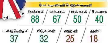 (கடிகாரச் சுற்றுப்படி) ரிஷி சுனக், பென்னி மாா்டன்ட், லிஸ் ட்ரஸ், நாதிம் ஸஹாவி, டாம் டுகென்தாட், சூவெல்லா பிரேவா்மன், ஜெரிமி ஹன்ட், கெமி பேடனாக்.
