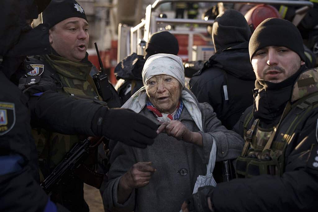 தாக்குதல் நடத்தப்பட்ட குடியிருப்பில் சிக்கிய மூதாட்டியை மீட்கும் ராணுவ வீரர்கள்