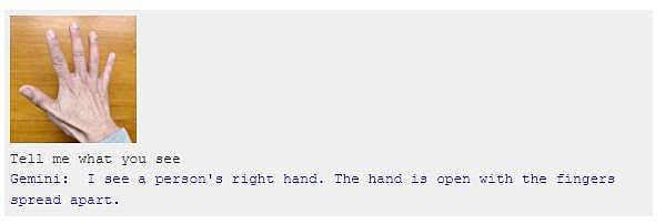 ஆனால், உண்மையில் ஜெமினிக்கு மூன்று புகைப்படங்கள் காட்டப்பட்டு, 'இதில் என்ன காட்டப்படுகிறது' என ஒருவர் கேட்க, ஜெமினி அதற்கு 'ஒரு கையில் இரண்டு எனும் எண்ணைக் காண்பிக்கிறீர்கள், மற்றொரு கையை மடித்து வைத்திருக்கிறீர்கள்' எனப் பதிலளிக்கிறது. பின் 'இது என்ன விளையாட்டு?' என மீண்டும் ஒரு கேள்வி கேட்ட பின்தான் ஜெமினி 'ராக் பேப்பர் சிசர்' எனப் பதிலளிப்பதாக கூகுள் தனது ப்ளாக் பக்கத்தில் எழுதியுள்ளது.