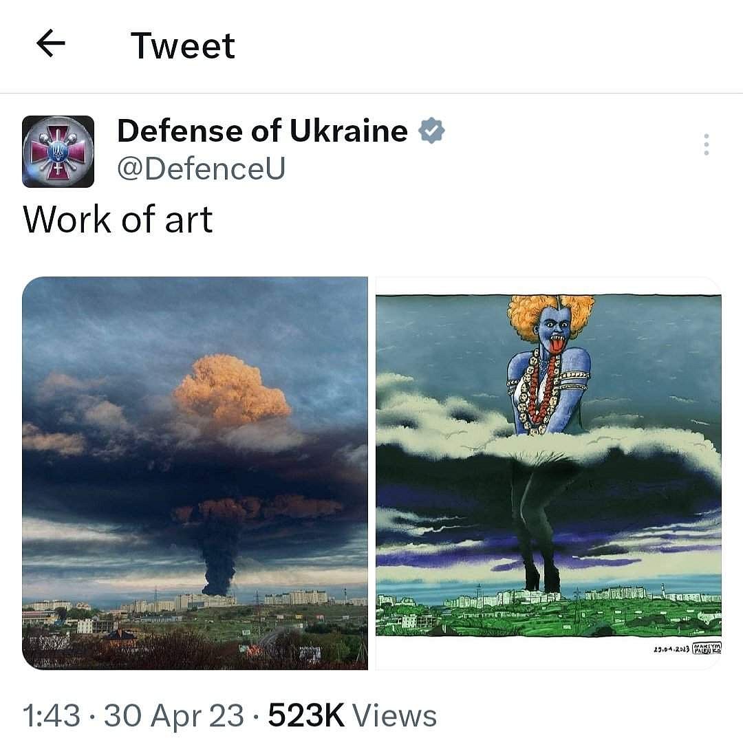 இந்நிலையில் புகைக்கு மேல் ஒரு பெண்ணின் படத்தை சித்தரித்து உக்ரைன் பாதுகாப்பு அமைச்சகம் ஒரு ட்வீட் செய்திருந்தது. அந்த பெண்ணின் உருவம் காளி உருவத்தை ஒத்திருந்ததாக சமூக வலைத்தளங்களில் பலரும் கண்டனம் தெரிவித்தனர்.