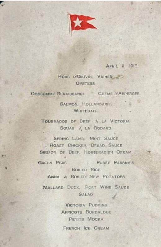 அமெரிக்கா நோக்கிய தனது பயணத்தில் கப்பல் அயர்லாந்தில் இருந்து புறப்பட்ட மறுநாள், ஏப்ரல் 11 இந்த மெனு பரிமாறப்பட்டுள்ளது.