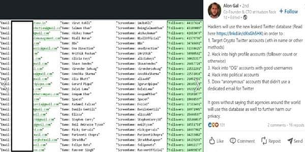 பாதுகாப்பை மீறி 20 கோடி ட்விட்டர் பயனாளர்களின் மின்னஞ்சல் முகவரிகள், தொலைபேசி எண்களை ஹேக்கர்கள் ஹேக் செய்துள்ளதாக ஆராய்ச்சியாளர் ஒருவர் கூறியுள்ளார். ஹேக்கர்கள் ஹேக் செய்துள்ள தரவுகளில் விராட் கோலி, சல்மான் கான் மற்றும் பிற பிரபலங்கள் அடங்குவர். ஹேக் செய்துள்ள தகவல்களை ஹேக்கர் குழுமத்தில் மர்மநபர்கள் வெளியிட்டுள்ளனர். இந்த தகவல் வெளியானதை அடுத்து, ட்விட்டர் பயனாளர்கள் மிகவும் கவலையடைந்துள்ளனர்.