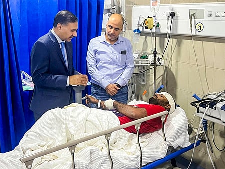 குவைத்தின் மெங்காஃப் பகுதியில் அடுக்குமாடி குடியிருப்பில் பற்றியெரியும் தீ. ~தீ விபத்தில் பாதிக்கப்பட்டு சிகிச்சை பெற்று வருபவரை பாா்வையிட்ட குவைத்துக்கான இந்திய தூதா் ஆதா்ஷ் ஸ்வைகா.