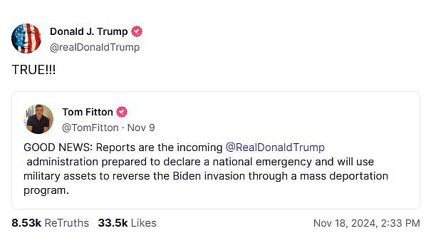 இந்த நிலையில், ட்ரூத் சோசியல் சமூக ஊடகத்தில், டிரம்ப் தலைமையிலான ஆட்சியில் தேசிய அவசரநிலை கொண்டு வரப்பட்டு, ராணுவத்தை பயன்படுத்தி பெருமளவிலான புலம்பெயர்ந்தவர்களை நாடு கடத்தவுள்ளார் என்று ஒருவர் பதிவிட்டிருந்தார்.