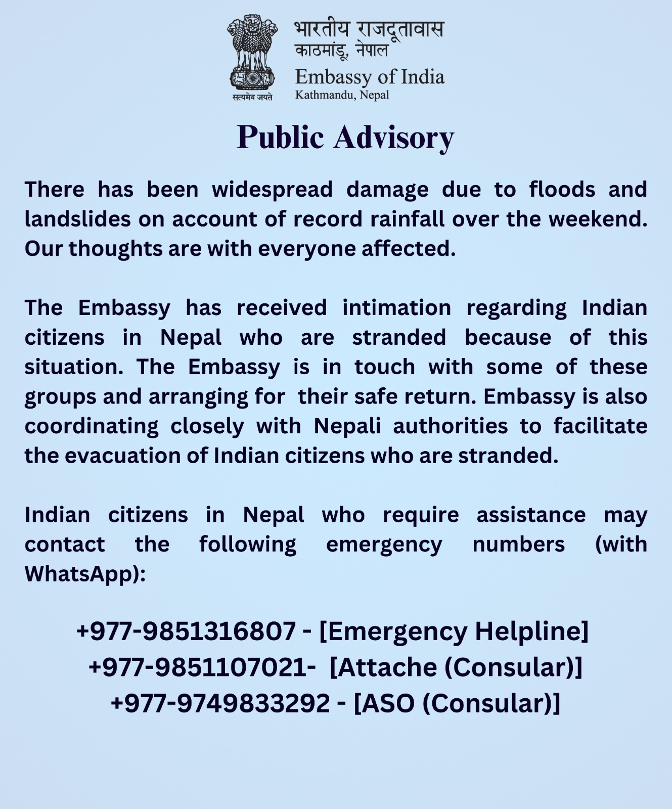 இந்நிலையில், நேபாளத்தில் உள்ள இந்தியர்களுக்காக உதவி எண்களும் அறிவிக்கப்பட்டுள்ளன. அதன்படி, கீழ்காணும் அவசரகால தொலைபேசி எண்கள் மூலமாக இந்திய தூதரகத்தை தொடர்புகொள்ளலாம் என நேபாளத்தில் உள்ள இந்திய தூதரகம் தெரிவித்துள்ளது.