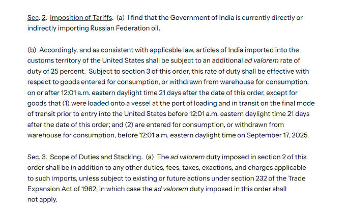 இதனால், அமெரிக்க வணிகக் கொள்கைக்கு பொருந்தக்கூடிய சட்டத்திற்கு இணங்க, அமெரிக்காவின் சுங்கப் பகுதிக்குள் இறக்குமதி செய்யப்படும் இந்தியப் பொருள்களுக்கு 25 சதவீத கூடுதல் வரி விதிக்கப்படும் எனத் தெரிவிக்கப்பட்டுள்ளது.