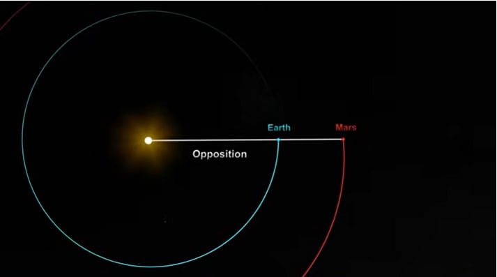இந்த நிலையில், சூரியனைச் சுற்றிவரும் பாதையில் ஒரே இடத்தில் கோள்கள் அணிவகுப்பது மட்டும் எவ்வாறு தனித்துவமான நிகழ்வாக மாறியிருக்கிறது. அதாவது, நாம் செவ்வாய்க் கோளை பார்க்கப் போகிறோம் என்றால், நமக்குப் பின்னால் சூரியன் இருக்கிறது என்று அர்த்தமாம்!