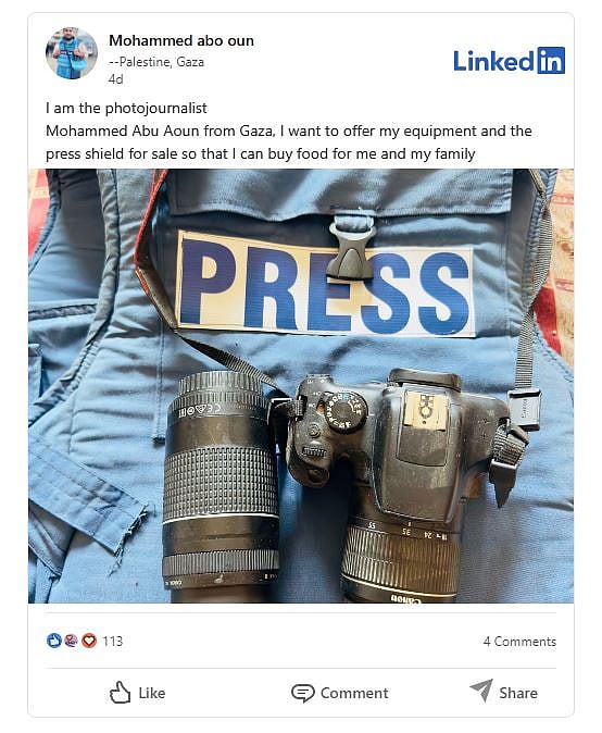 காஸாவில் பணிபுரிந்துவரும் புகைப்பட பத்திரிகையாளர் முகம்மது அபு வோன் லிங்க்டுஇன் சமூக வலைதளப் பக்கத்தில் உணவுக்காக தனது புகைப்படக் கருவியையும், பாதுகாப்பு உபகரணத்தையும் விற்பனைக்கு அறிவித்துள்ளார்.