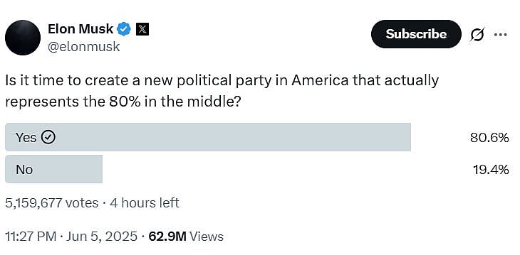 இதனைத் தொடர்ந்து, தனது எக்ஸ் தளத்தில், அமெரிக்காவின் 80 சதவிகித நடுத்தர மக்களின் பிரதிநிதியாக ஒரு புதிய கட்சியைத் தொடங்குவதற்கான நேரம் வந்துவிட்டதா? என்று எலான் மஸ்க் வாக்கெடுப்பு நடத்தியுள்ளார்.
