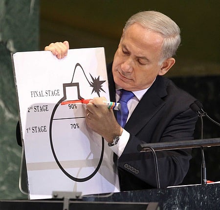 2012-ஆம் ஆண்டு ஐ.நா. சபை உரையின்போது ஈரானின் அணு குண்டை அவா் வரைபடமாகக் காட்டியது பரபரப்பாக பேசப்பட்டது. அணு ஆயுத எரிபொருளாகப் பயன்படுத்துவதற்கு ஏற்ற வகையில் யுரேனியத்தை ஈரான் மிகவும் அதிகமாக செறிவூட்டி வருவதாகவும் விரைவில் அந்த நாடு அணு ஆயுத்ததை அடைந்துவிடும் என்று அப்போது அவா் கடுமையாக எச்சரித்தாா்.