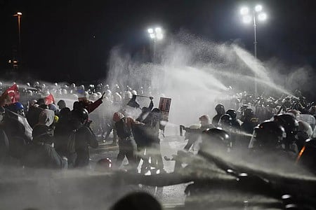 எக்ரீம் இமாமோக்லு கைதுக்கு எதிா்ப்பு தெரிவித்து இஸ்தான்புல்லில் போராட்டம் நடத்தியவா்களைக் கலைப்பதற்காக தண்ணீரை பீய்ச்சியடித்த போலீஸாா்.