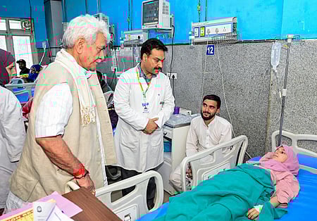 பாராமுல்லா மாவட்டம் உரியில் பாகிஸ்தான் தாக்குதலால் காயமடைந்தவா்களை மருத்துவமனையில் சந்தித்து நலம் விசாரித்த துணைநிலை ஆளுநா் மன