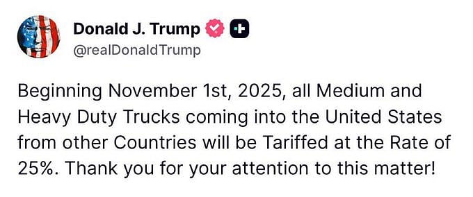 அதிபர் டிரம்ப் தன்னுடைய ட்ரூத் சோசியல் பக்கத்தில், “நவம்பர் 1 ஆம் தேதிமுதல், பிற நாடுகளிலிருந்து அமெரிக்காவிற்குள் வரும் அனைத்து நடுத்தர மற்றும் கனரக லாரிகளுக்கும் 25 சதவிகித வரி விதிக்கப்படும்” எனப் பதிவிட்டுள்ளார். மேலும் எந்த விவரங்களையும் அவர் சேர்க்கவில்லை.
