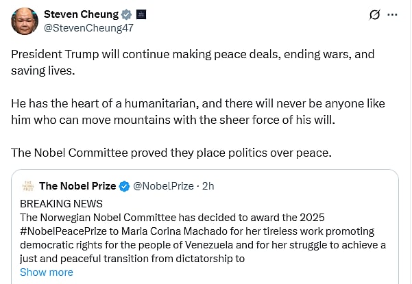 இது தொடர்பாக அவர் நோபல் பரிசு குழுவின் பதிவை மறுப்பதிவிட்டு தனது எக்ஸ் பக்கத்தில் வெளியிட்டுள்ளார்.