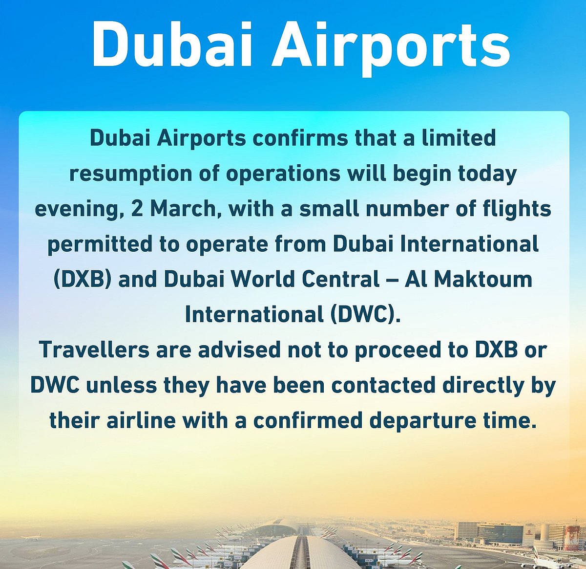 Dubai Airports confirms that a limited resumption of operations will begin today evening, 2 March